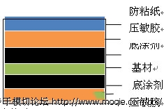 壓敏膠的基材有各種紙品,塑料薄膜,紡織品,金屬箔,泡沫塑料等,加上壓敏膠劑,底涂劑,防粘劑,離型紙(離型膜)等輔助材料組成。以雙面膠帶為例,其結構如下圖所示: